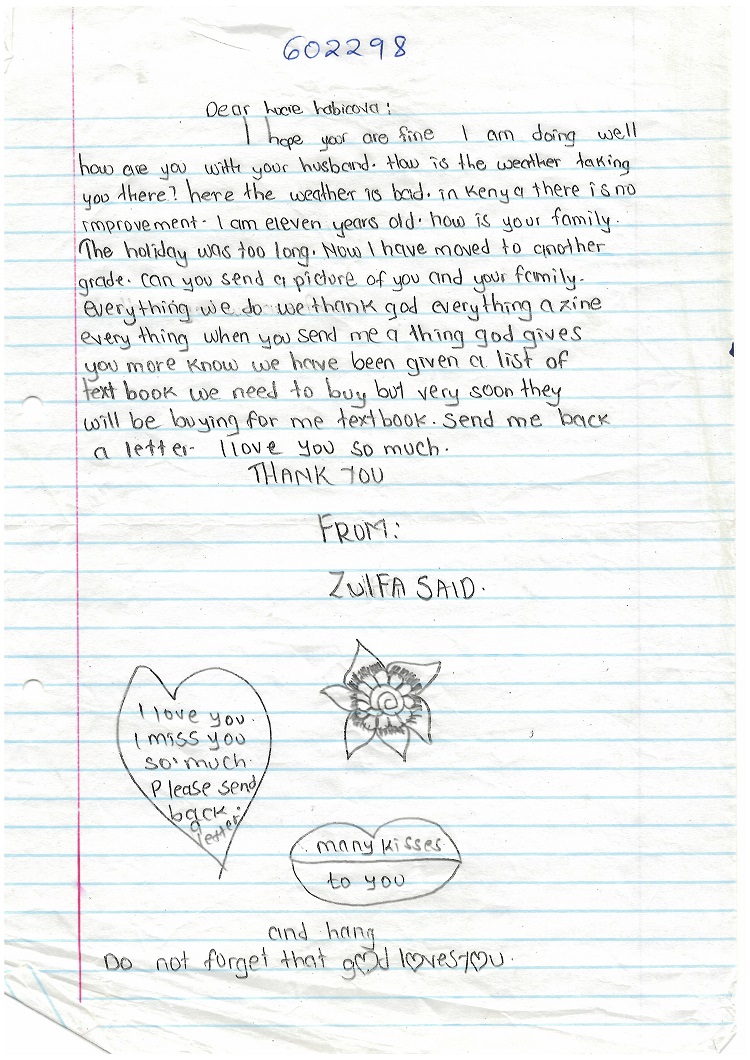 Popis situace: Zulifa má dva sourozence. Celá rodina žije ve slumu Kibera v Nairobi. Zulifina matka pracuje v obchodě. Z peněz, které vydělá, se snaží rodině zajistit obživu a bydlení, což často není jednoduché.