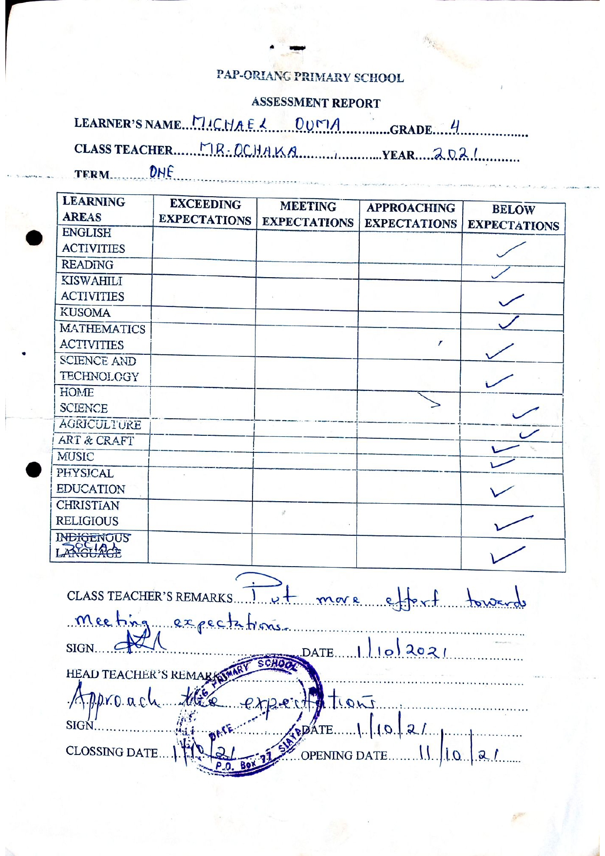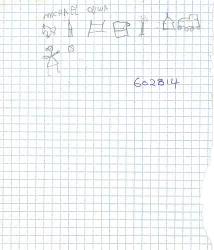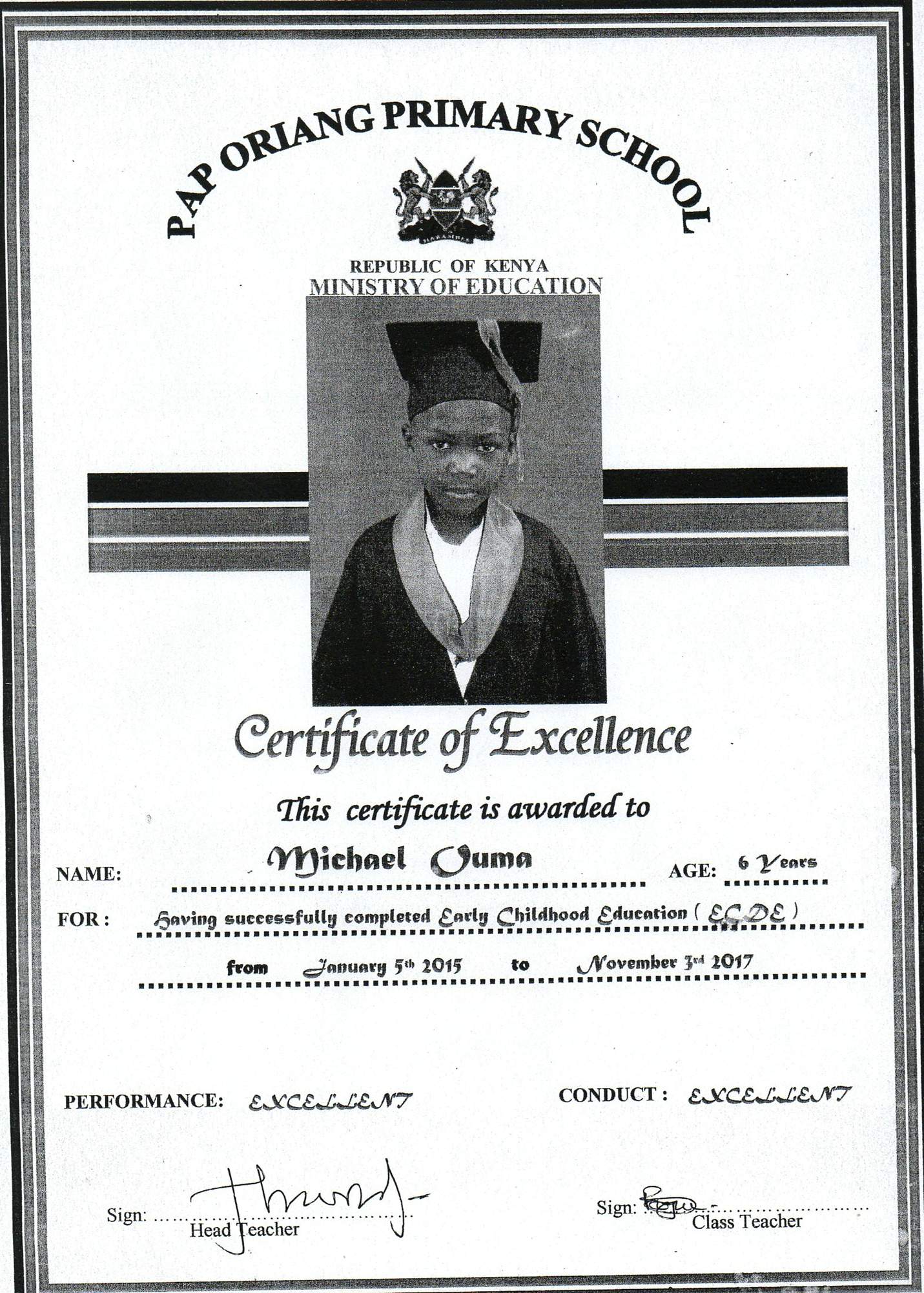 Popis situace: Michael žije se sourozenci a rodiči v hliněném domku ve vesnici Kogelo. Rodiče vykonávají příležitostně manuální práce, ale převážně je rodina závislá na úrodě z malé farmy. Michael je zdravý. Díky podpoře adoptivního rodiče může chlapec chodit do školy.