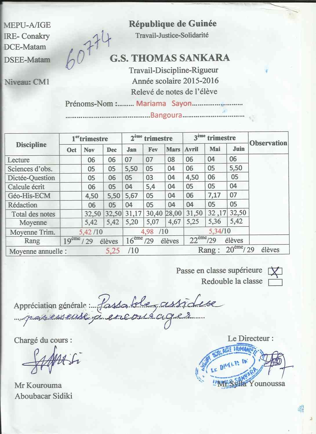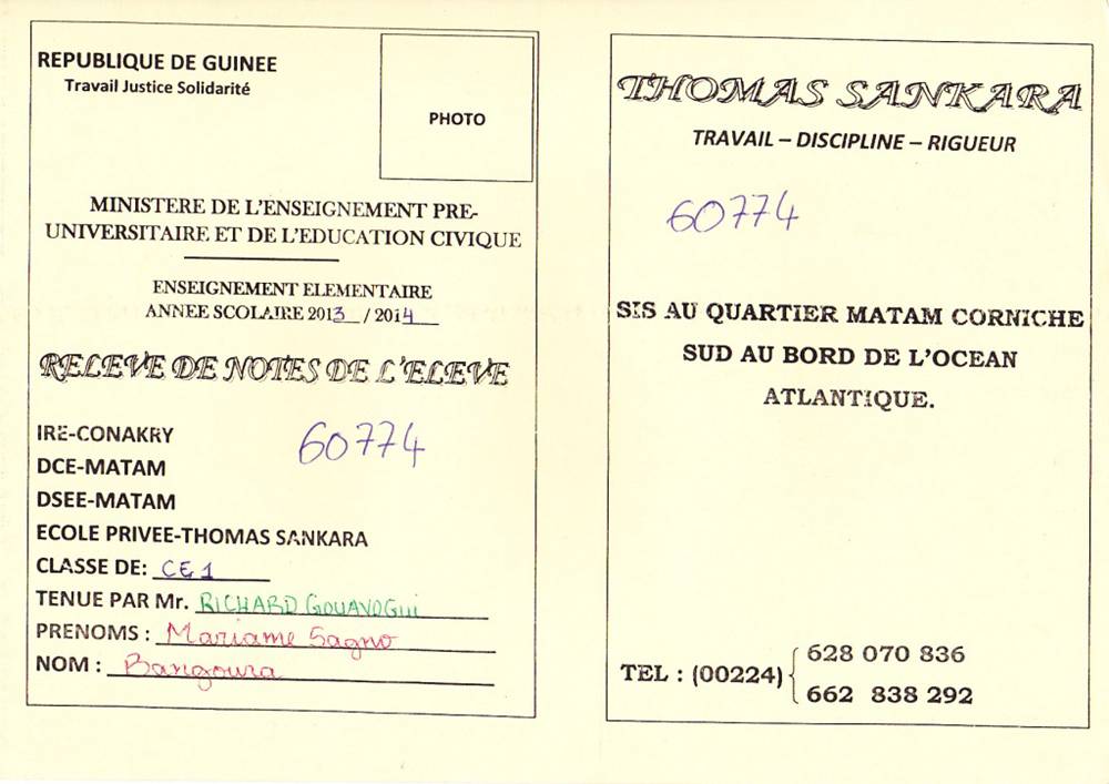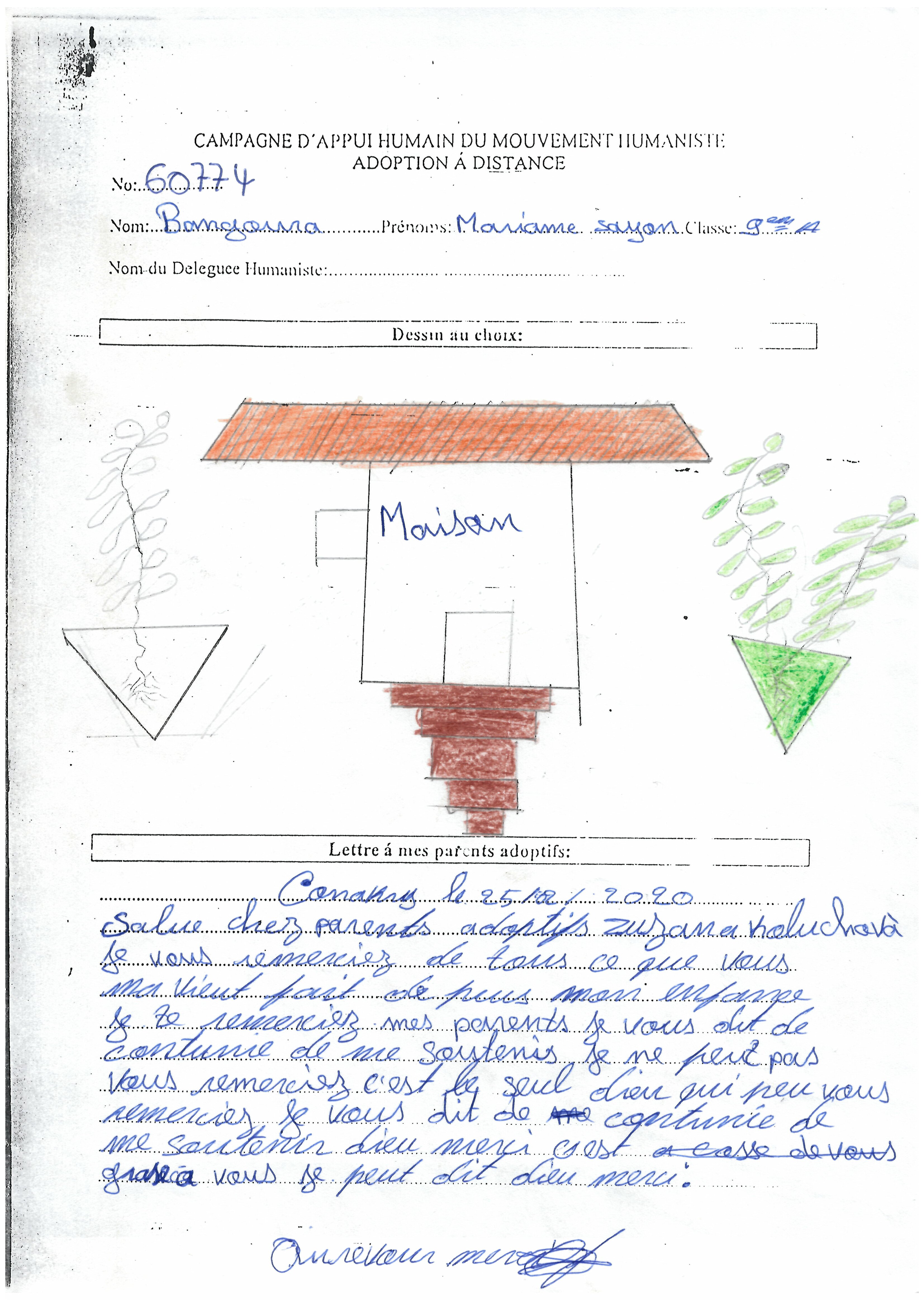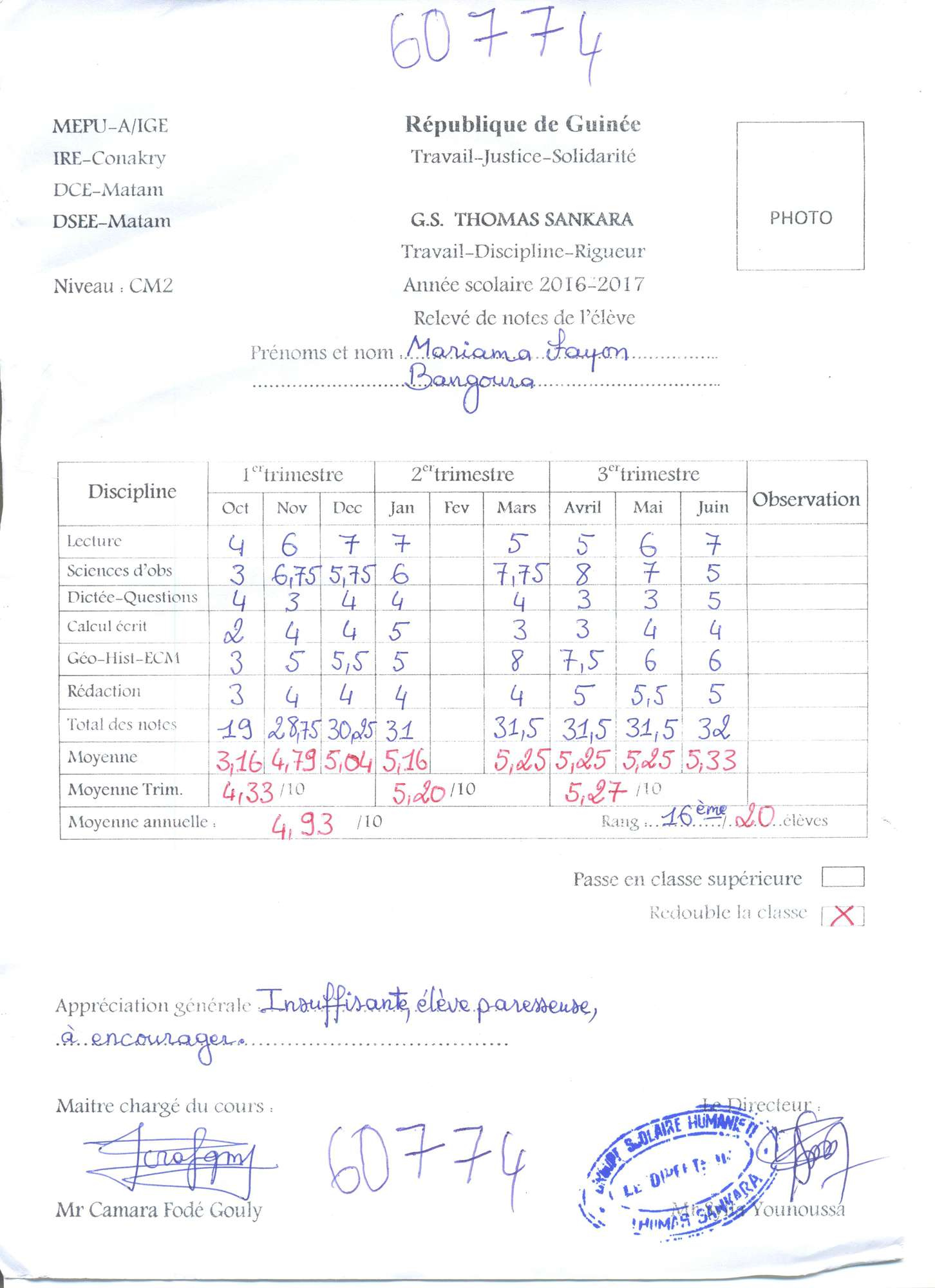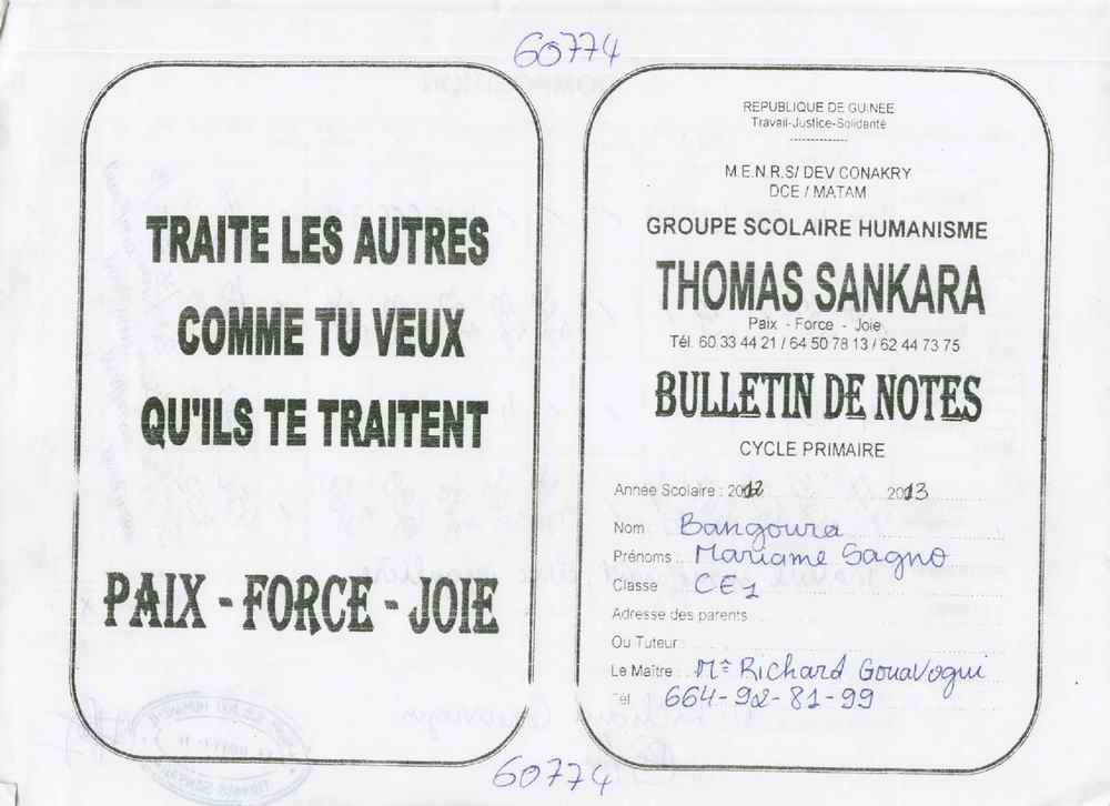 Mariama Sayon Bangoura byla adoptována v roce 2007 a dnes navštěvuje 9. třídu ve škole G.S.P. Elhadj Karamba Diaby (Matam).